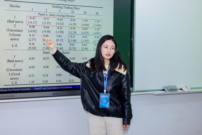 在“AI, Big Data and FinTech”分论坛,严露老师以ChatGPT and Cross-Section of Stock Returns: Evidence from China(《ChatGPT与股票收益横截面:来自中国的证据》)为题作报告。该研究联合湖南大学马勇教授共同完成,创新性地探究了未经系统金融训练的ChatGPT模型在中文文本中提取股票收益预测信息的能力,其研究设计严谨、视角独特,引发了与会学者的热烈讨论与高度评价。