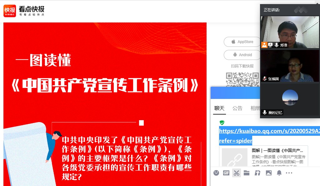 为深入学习和贯彻《中国共产党宣传工作条例》,2020年6月21日晚上7点半,伟德国际1946国贸党支部通过腾讯会议开展在线学习活动,会议由党总支部书记郑准为大家讲解《中国共产党宣传工作条例》的主要内容。国贸党支部全体党员参与学习。