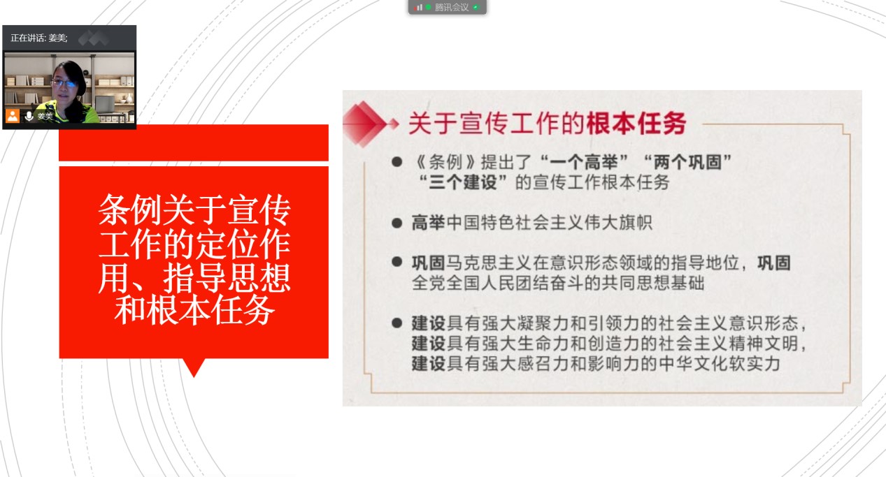 姜美书记认为,制定《中国共产党宣传工作条例》,是落实全面依法治国、全面从严治党的重大举措。作为具有法学背景的专职大学教师,我们应该在做好本职工作的同时,学习和执行好党的各项方针、政策、制度,同时力所能及地做好宣传工作。
