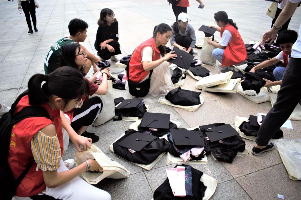 早上7点,入党积极分子们在公司拱门前召集毕业生,有序发放学士服,热情帮助学长学姐们穿毕业服、戴毕业帽、整理毕业帽上的流苏,学士服发放结束后,毕业生全体合影,随后一起前往田汉剧场。学士学位授予仪式结束后,入党积极分子回收各班学士服,逐一清点数量之后交给党支部助理,最后入党积极分子与员工党支部、员工会工作人员一同合影留念。