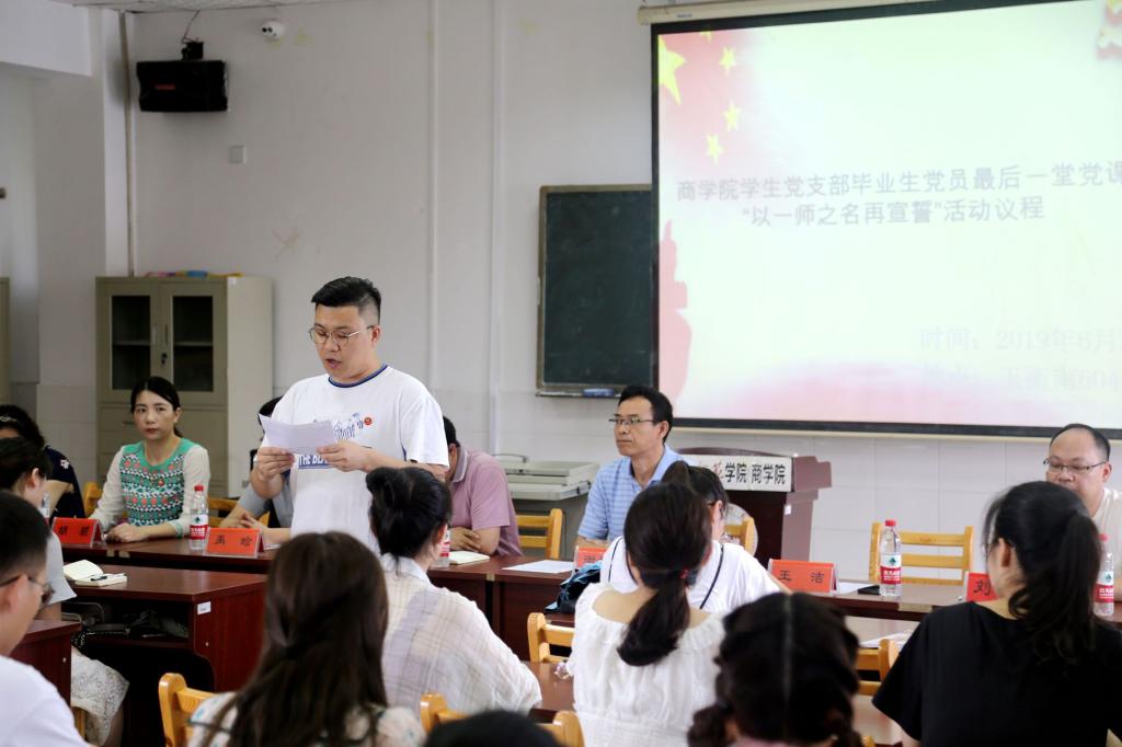 6月20日下午3点伟德国际1946员工党支部送给毕业生党员一份特殊的礼物——“最后一堂党课•以一师之名再宣誓”活动在玉衡南604教室隆重举行,公司党总支书记谢培松、副书记欧阳范剑、员工党支部书记禹晗、胡颖、教工一支部王洁、李芝、刘邵岚、刘志芳参加活动。欧阳范剑副书记全面总结伟德国际1946员工党建工作,胡颖老师对毕业生党员档案迁移事项进行说明,优秀毕业生党员代表15级会计3班向威进行发言,支部书记、教师、辅导员都送上了叮咛和嘱托,谢书记更对员工党员提出了“牢记初心和使命,肩负起国家和民族的希望”的明确要求。最后,谢书记带领全体党员重温入党誓词,并合影留念。毕业生党员会后表示,在今后的工作岗位上,一定会牢记党员身份和母校期望,传承和发扬“一师精神”,用竭诚奉献诠释好合格党员的责任与使命。