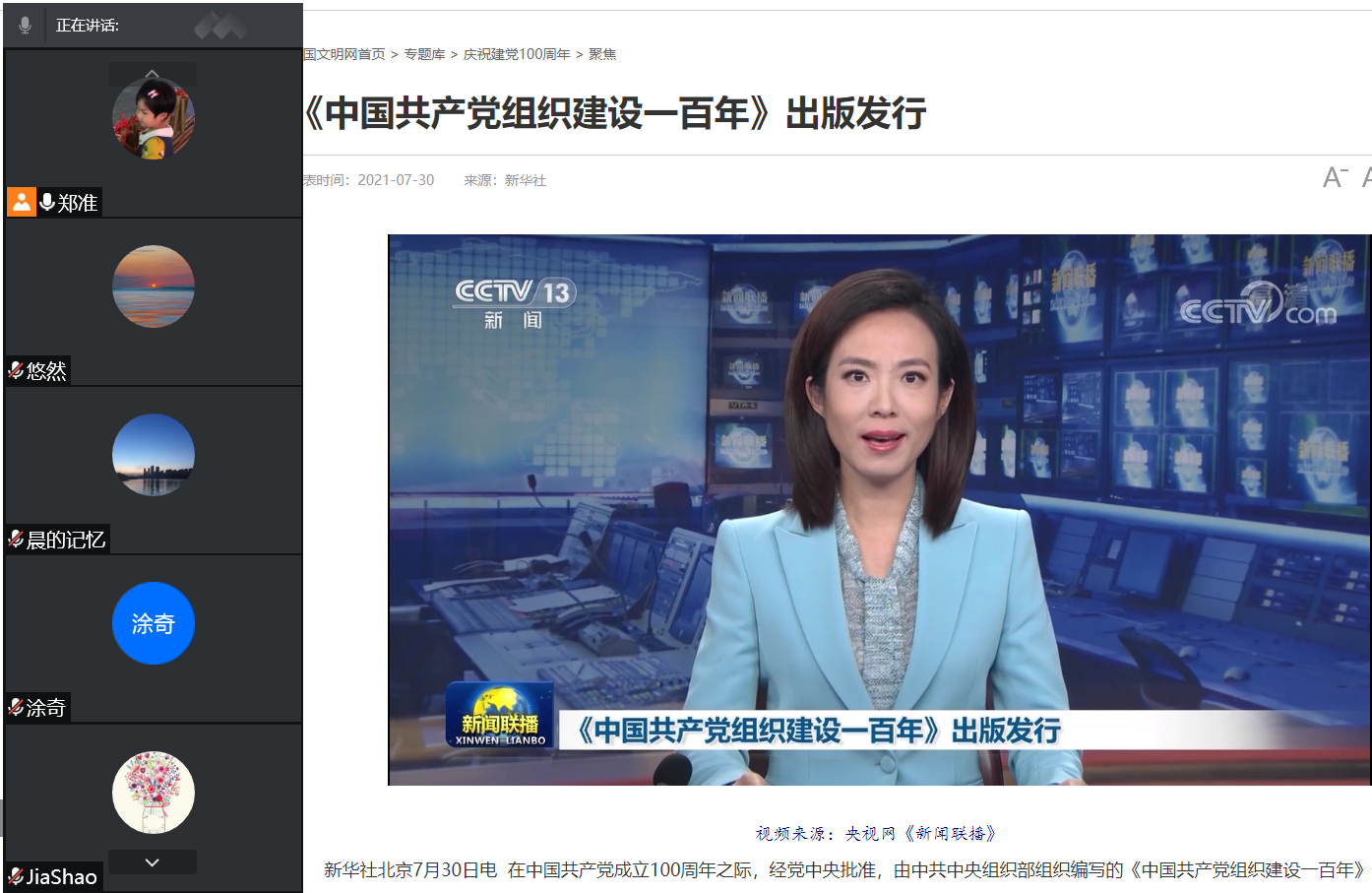 10月27日晚,伟德国际1946国际经济与贸易教研室党支部全体党员通过腾讯会议平台认真学习了重点书籍《中国共产党组织建设一百年》。