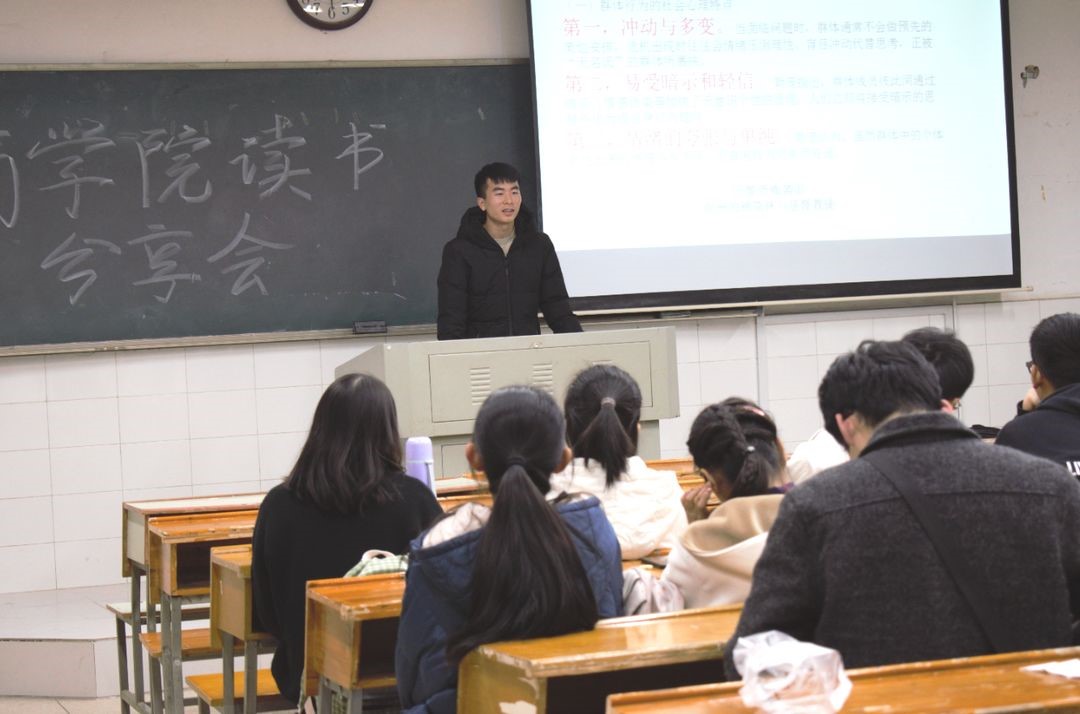 党支部助干徐启昊上台向大家分享当代纪实文学《苦难辉煌》。徐启昊同学简单介绍了这本书,并与大家分享自己读这本书的经历与感受,最后向大家讲述本书的大致内容。第二位上台分享的同学是青志协外联部副部长谭康达,谭康达向同学们推荐的是法国社会心理学家古斯塔夫创作的社会心理学著作——《乌合之众》。最后,徐培捷同学上台分享第三本书——英国古典经济学家亚当·斯密的《国富论》。