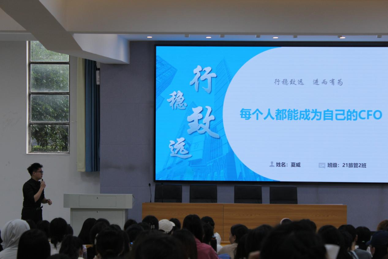 来自大三旅管专业的夏威同学以“每个人都能成为自己的CFO”为主题分享了自己学习成长的实践经验。首先介绍了自己向各大企业投递简历,模拟应届生的求职面试,在此过程中了解企业当今的用人需求和自己的不足之处;接着讲述了他在两次创业实践中的收获以及他是如何在自我的财富认知形成过程中找到人生理想并不断努力实践的信念。夏威同学丰富精彩的实践经验应证了那段话:船停靠在码头才最安全,但那不是造船的目的,人躺在床上才最舒服,但那不是人生的意义。这也激励着同学们勇于实践、追寻理想!