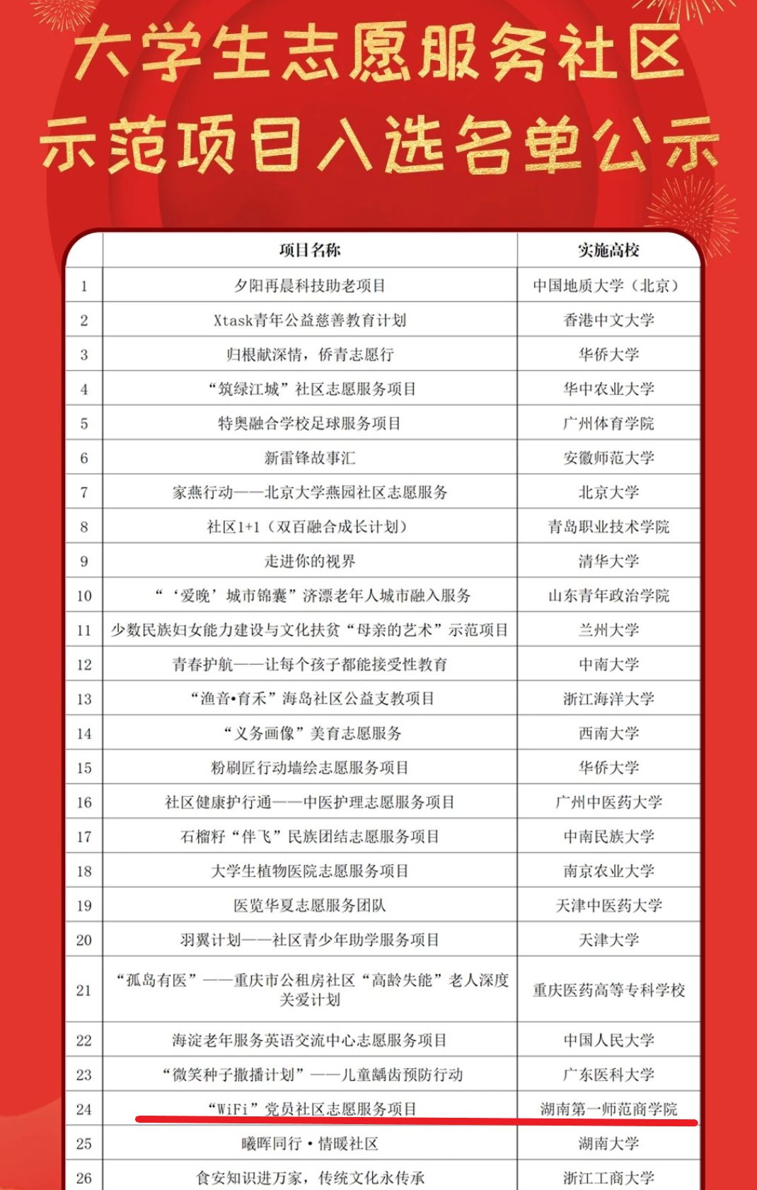 2019年9月,团中央青年志愿者行动指导中心、中国青年志愿者协会秘书处面向全国高校公开遴选老员工志愿服务社区示范项目,累计收到全国各高校申报项目1160个。10月21-28日,通过邀请专家阅览初评、集中打分等环节,包括湖南第一师范伟德国际1946“WiFi”党员社区志愿服务项目在内的等104个院校项目入选全国高校2019年度老员工志愿服务社区示范项目。