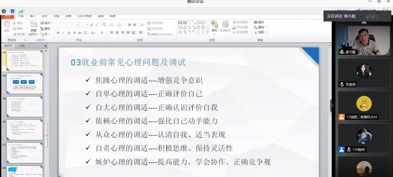此次就业指导系列课程包括“就业形势与政策”“就业定位与准备”“求职面试与签约”三个部分。张福国书记分析了2021年大学毕业生就业形势,介绍了就业政策以及公司考研考编等情况。张福国建议同学们摆正心态,树立正确的就业观念,实事求是,抓住机遇,找到自己满意的工作。黄小喜经理从同学们就业前常见的心理问题及调试、当今社会用人标准、招聘侧重点等方面向毕业生分享了如何调整就业定位,如何进行就业准备等。李辉华副书记主要为同学们讲解了如何有效获得更多就业信息、如何制作一份优秀的简历、面试礼仪、常见面试形式和面试问答等同学们求职面试中普遍关心的问题,并提出了自己的就业建议,希望同学们抓紧做好职业生涯规划,明确求职意向,坚定理想信念,创新求职思路,整合有利资源,实现自己的就业理想。