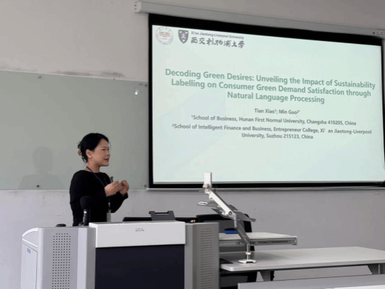 26日下午,肖恬老师主持了平行分论坛2,并进行了名为Decoding green desires: Unveiling the impact of sustainability labeling on consumer green demand satisfaction through natural language processing(解码绿色希冀:借助自然语言分析模型揭示可持续标签对满足消费者绿色需求的影响)论文宣讲。该研究与西交利物浦大学的郭珉老师合作完成,旨在研究亚马逊电商平台可持续标签产品营销对消费者满意度的影响。报告得到英国杜伦大学伟德国际1946、《Journal of Service Research》期刊副主编 Markus Blut 教授及在场其他学者的高度评价,激发了与会者的热烈讨论。