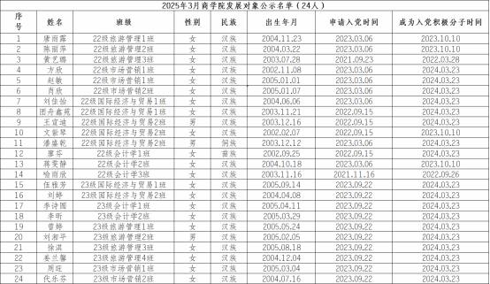 根据个人现实表现、团组织推优和党支部培养教育考察情况,公司党委逐个审议,拟确定唐雨露等24名入党积极分子为党员发展对象。现将名单公示如下: