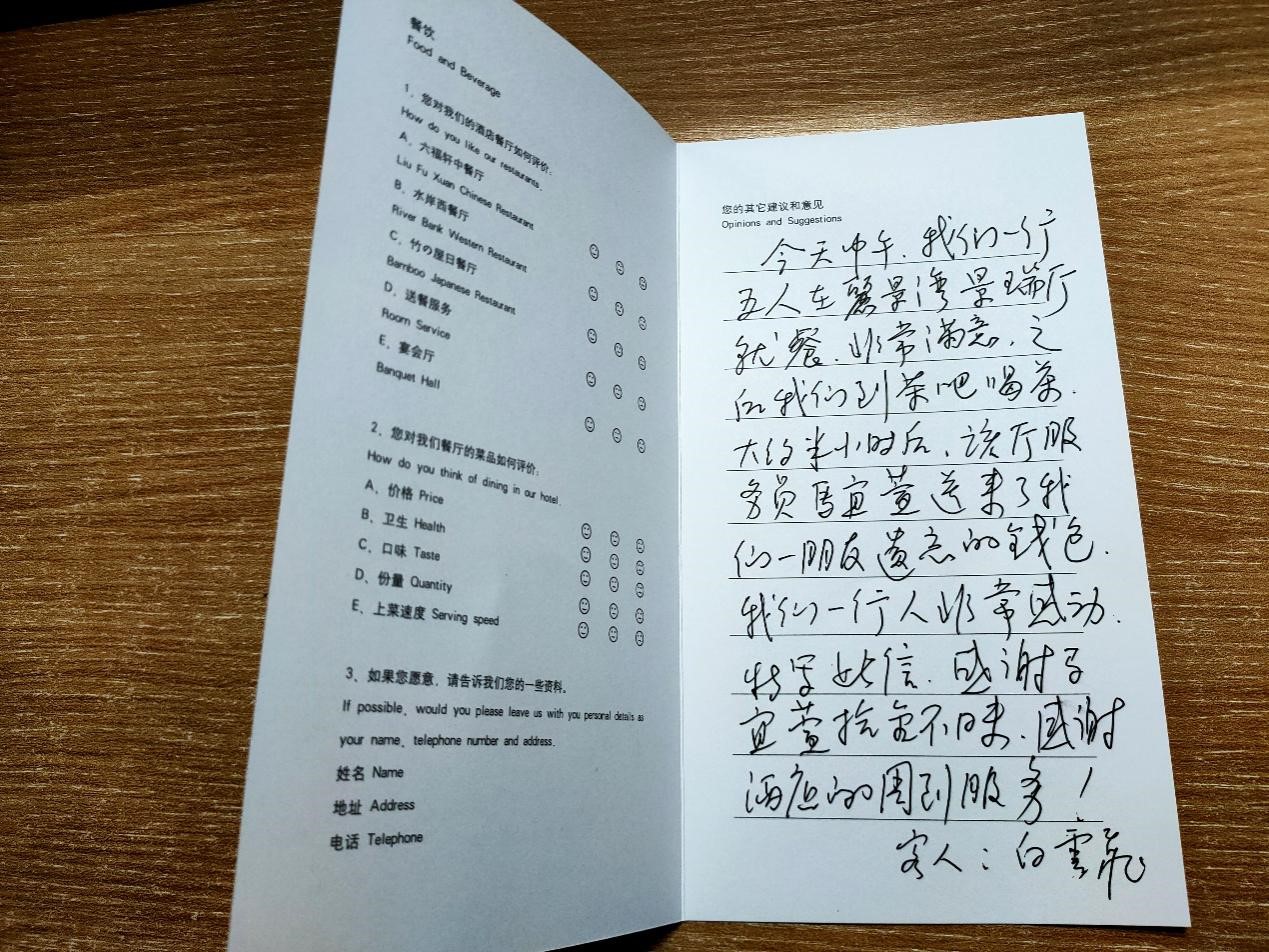 马宜萱同学表示:这个月是辛苦的一个月,也是快乐的一个月。在工作中,我收到了人生中的第一封表扬信,并且是客人离开后又专程回来为我写的。看到这封情谊满满的信,我非常感动,真正感觉到自己的工作得到了回报。酒店也非常重视这次荣誉,餐饮部领导亲自为我发放了奖金,以鼓励大家认真工作真诚服务。