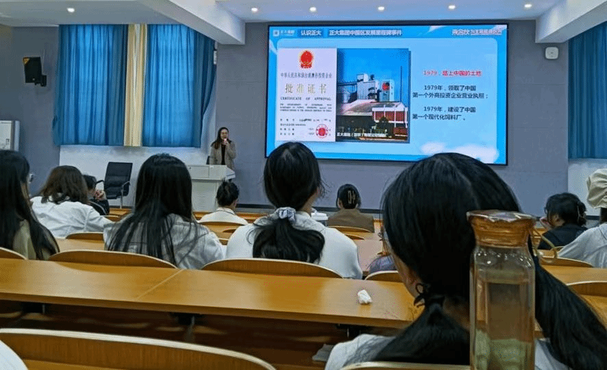 杨云女士及其团队成员吴亮经理为同学们介绍了正大集团在湖南的发展情况以及正大集团的发展模式及特色。杨云女士重点为同学们分享了正大集团的全产业链布局思路,从“种子-种植-饲料-养殖-屠宰-食品深加工-现代物流-零售-餐桌”的食品安全均可追溯,具备“全产业链开发、全过程可追溯、全资源可循环、全智能化生产”的能力,增强拓新了同学们对产业链布局的认知。