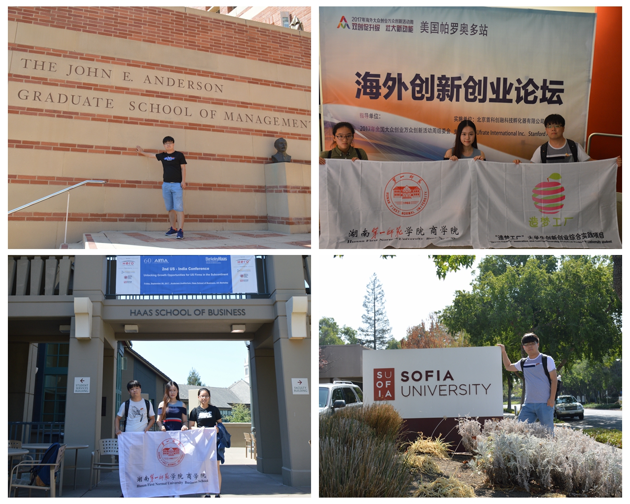在美期间,他们先后在加利福尼亚洲茉莉塔市YESplase青年创新基地进行学习,并参观了当地个体创业企业、入住美国家庭进行寄宿生活体验;参观茉莉塔市政府、并听取茉莉塔市经济官员、商会代表分享美国当地的创业政策;参观美国加州大学洛杉矶分校、伯克利分校、参观斯坦福大学、参观索菲亚大学(硅谷创新中心);参观谷歌、Autodesk 3D绘图与仿真软件公司、硅谷著名企业孵化加速器PlugandPlay等硅谷知名的企业机构等;参观全国大众创业万众创新活动周“美国帕罗奥多站”海外创新创业论坛。
