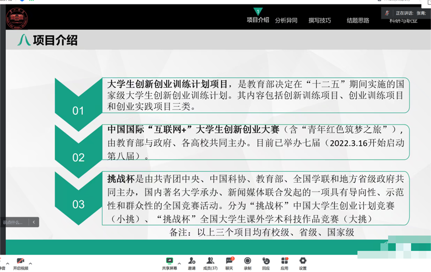 伟德国际1946创新创业专干张青老师就创新创业工作进行深入的培训。他以职业生涯与学术研究为题,以老员工创新创业训练项目为例,结合自己的经验和专业知识,给同学们带来了创新创业的新理念和新方法,使大家对创新创业工作和项目申报有了更深入的了解。