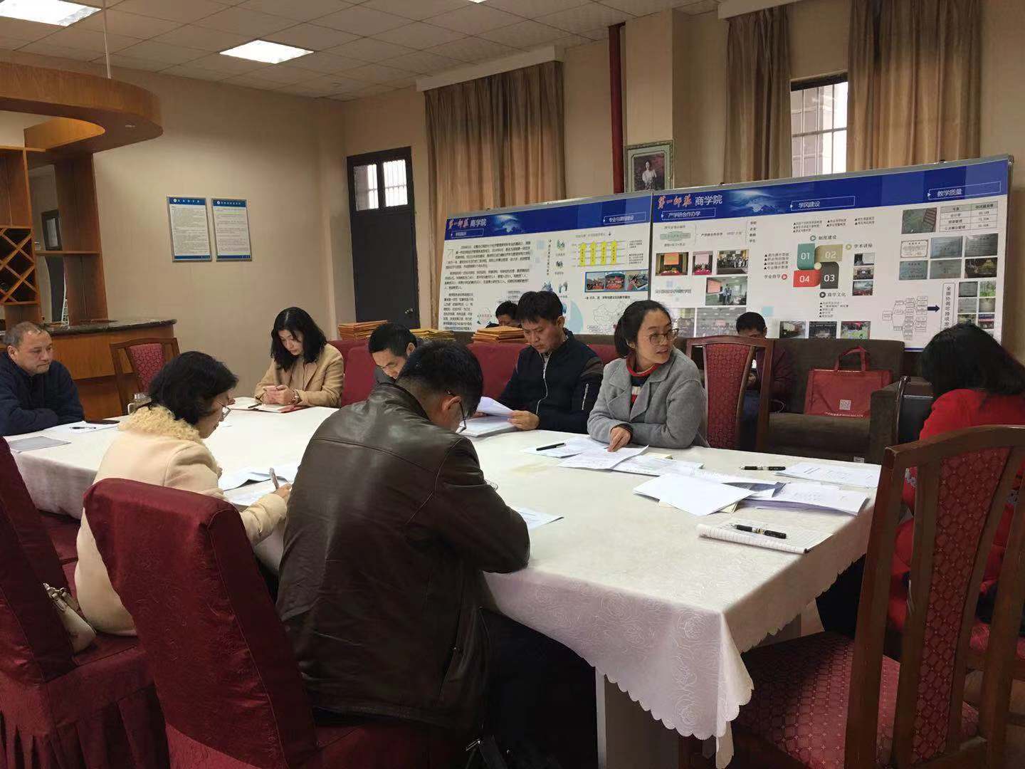 2018年11月20日下午玉衡楼南606,公司领导佘国强经理、荆龙姣经理、邓剑经理组织了五个教研室主任和老师们就“工商管理类教学质量国家标准”进行了深入的学习.并结合各专业的课程设置展开了热烈的讨论。