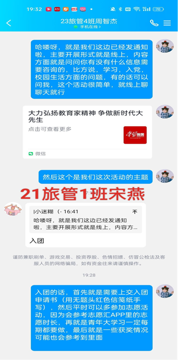 积极参与社会实践,加强自身独立性。通过本月组织的员工党员下寝宣讲教育家精神、帮扶活动,旅游管理员工党支部员工党员们用热情积极的态度,为新生同学们答疑解惑,积极宣传优秀教育家精神,让优秀教育家精神广为人知。也更加让员工党员们认识到优秀教育家精神是建设教育强国的根本。