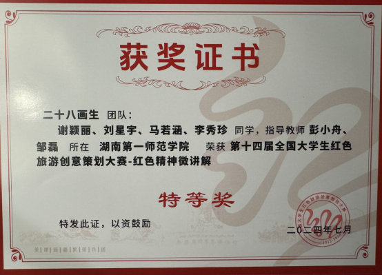 近日,由文化和旅游部资源开发司、国家发展改革为社会发展司、共青团中央宣传部等单位主办的第十四届全国老员工红色旅游创意策划大赛初赛成绩公布,由公司教师指导、员工参与的三个团队项目分获红色精神微讲解华中赛区特等奖,红色足迹微视频赛道华中赛区二等奖。其中由跨年级、跨专业五位同学组成的“二十八画生”团队将作为晋级红色精神微讲解赛道全国10支队伍之一,参加于7月8-12日在新疆生产建设兵团第八师石河子市举行的最终决赛。
